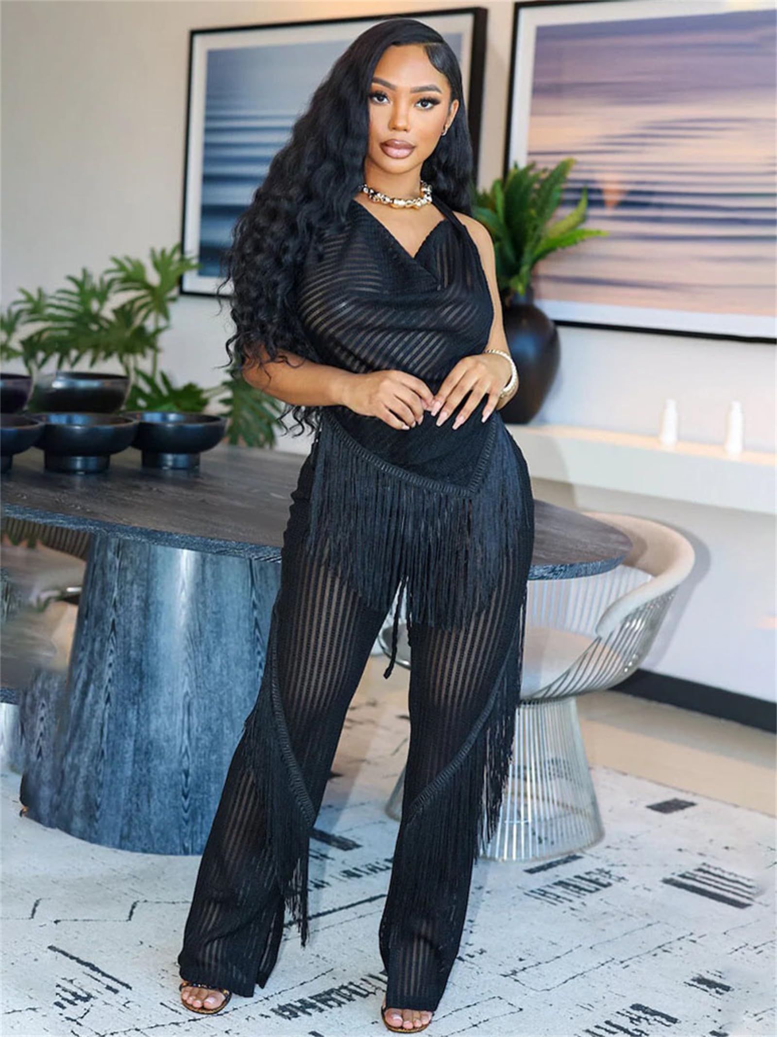 women sexy 2 piece pant set Black Large 2