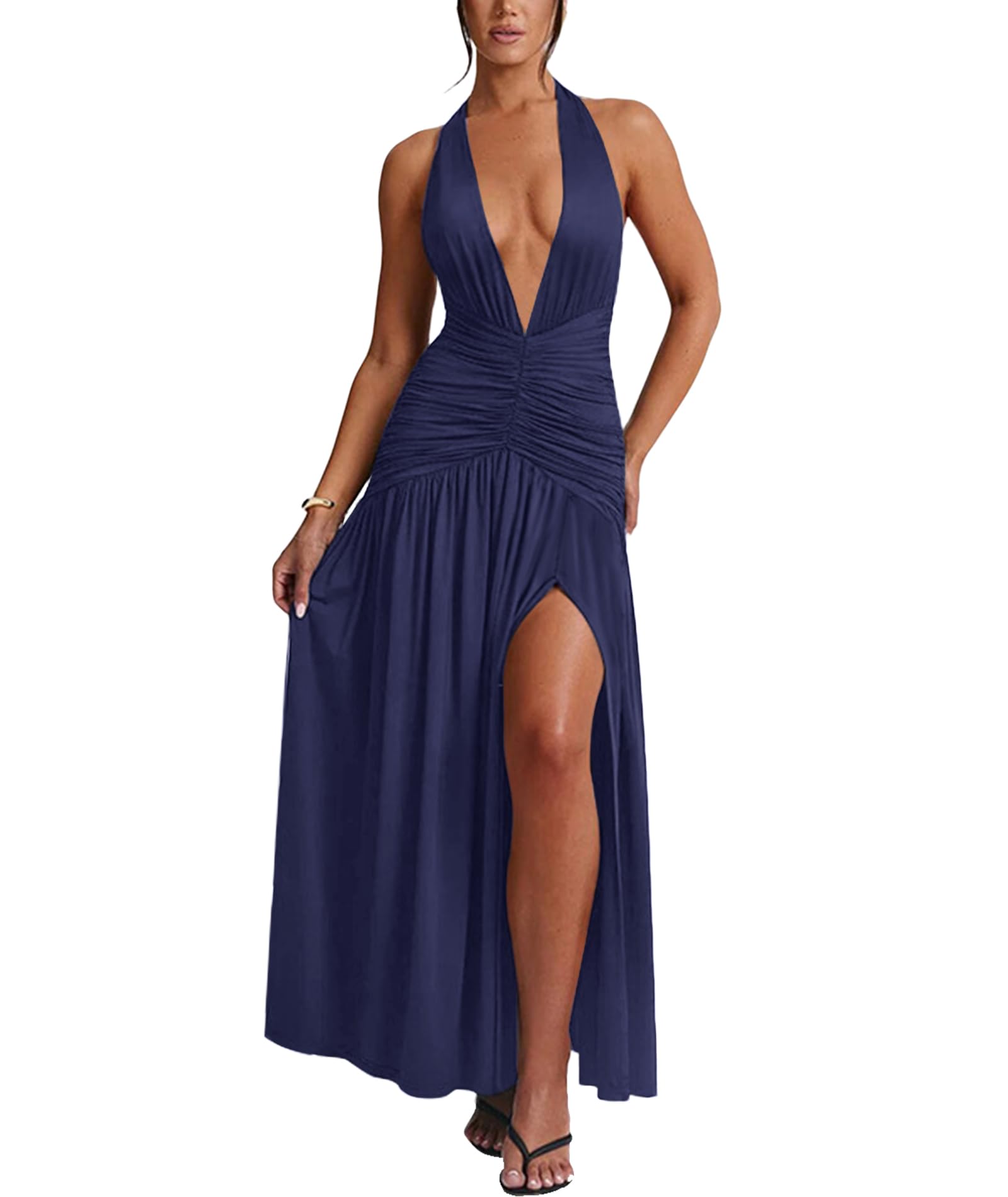 Women Sexy Halter Deep V Maxi Dress Navy X-Large 1