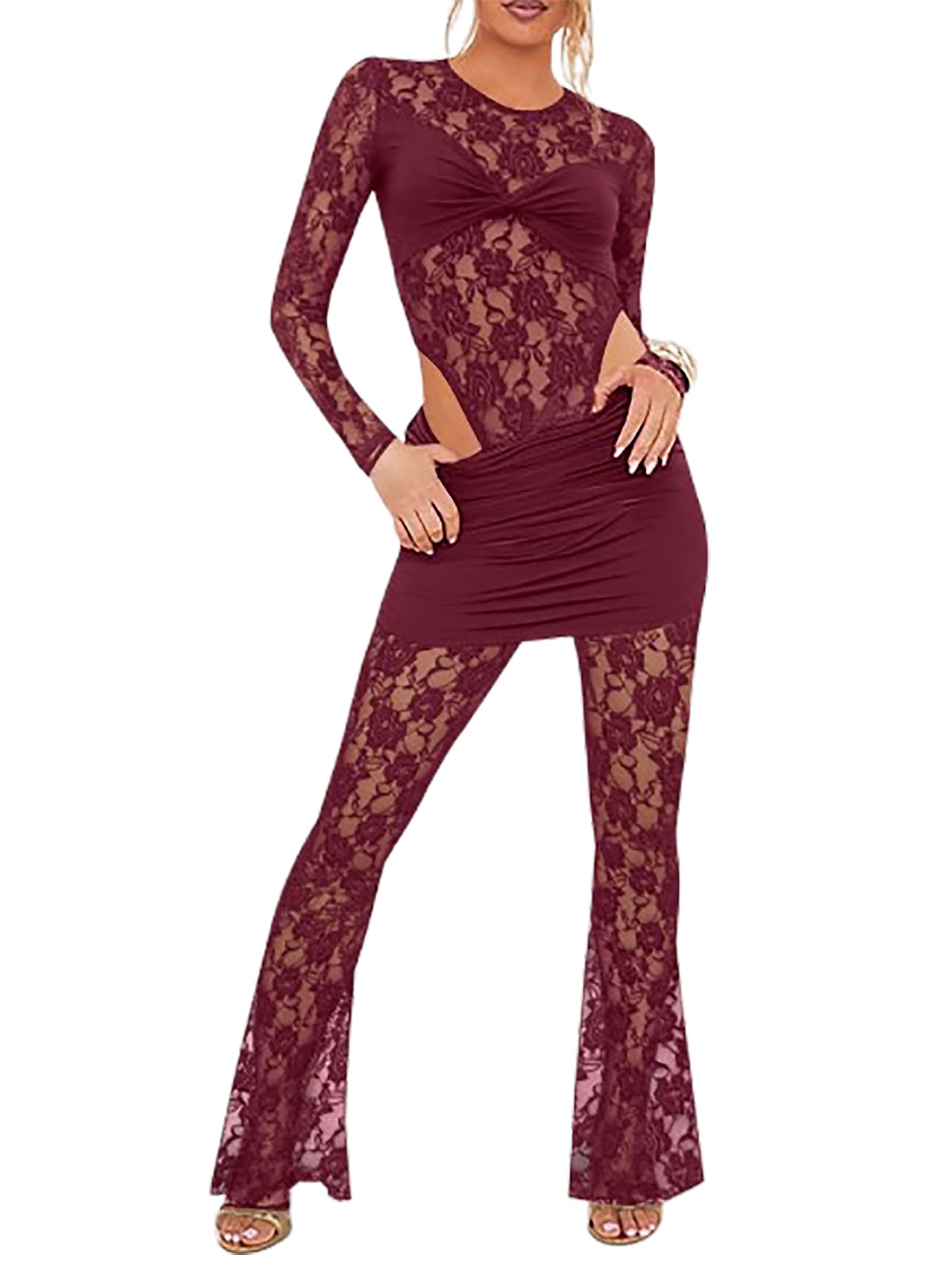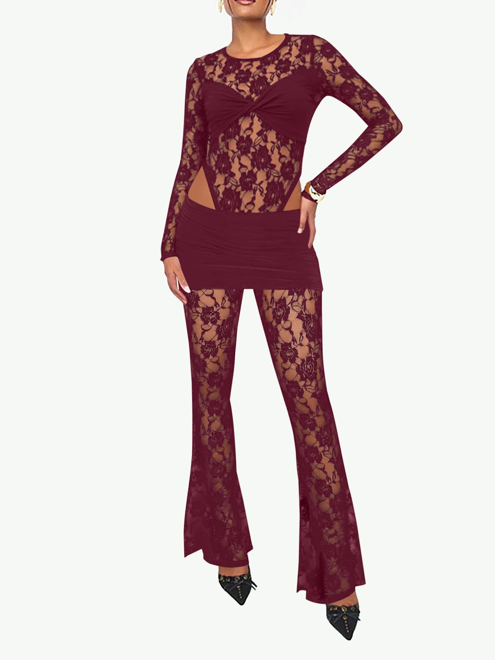 women lace 2 piece pant set Winered Large 3