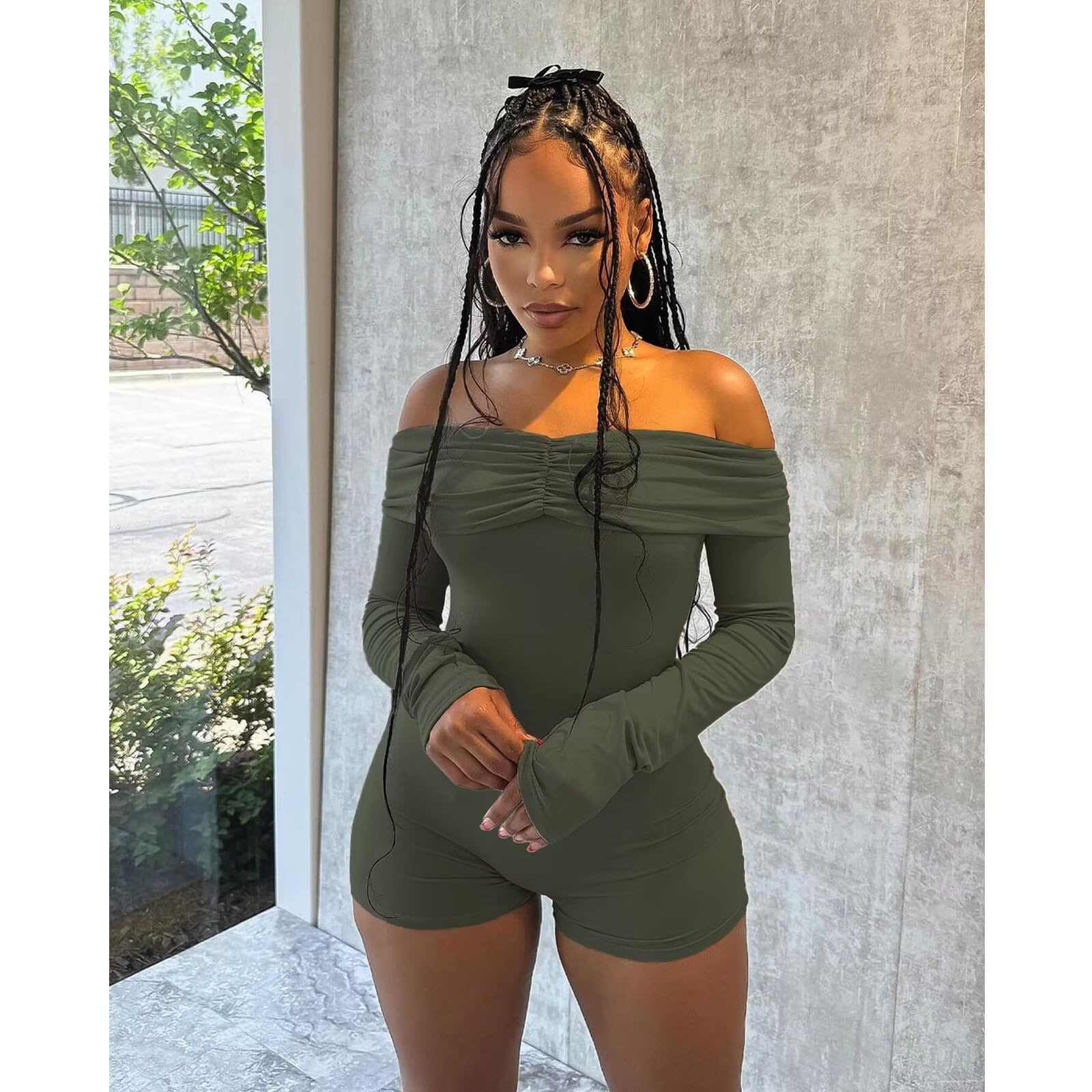Off Shoulder Pleated Short Jumpsuit Green Large 1