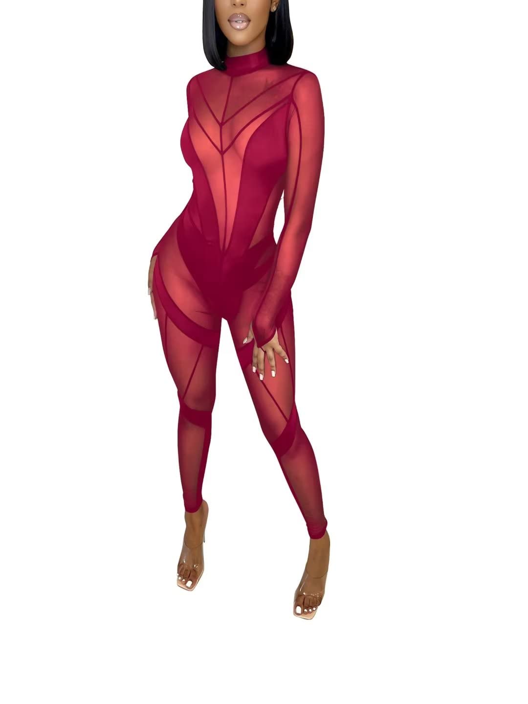 Sheer Mesh Splicing Jumpsuit Wine Red Large 2