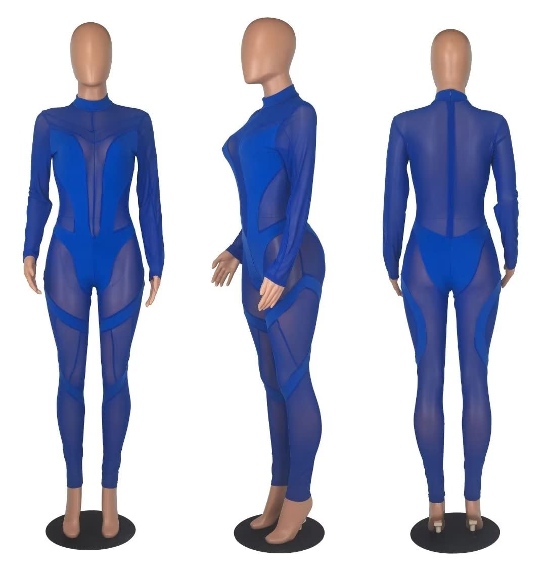 Sheer Mesh Splicing Jumpsuit Blue Medium 1