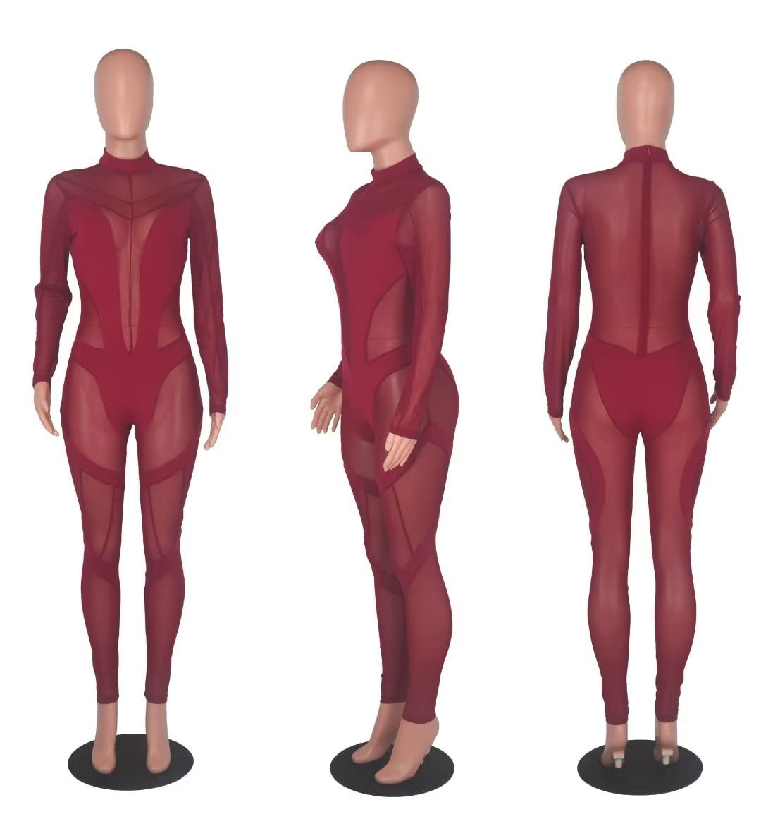 Sheer Mesh Splicing Jumpsuit Wine Red Medium 3