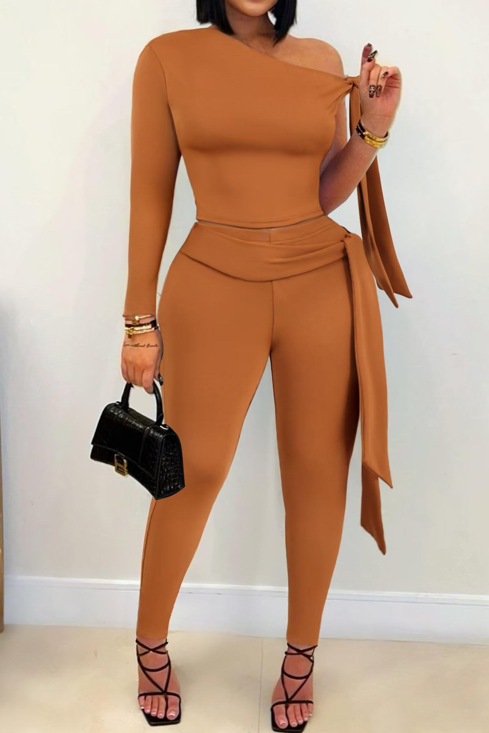 Women One Shoulder Pants Set Club Brown X-Large 3