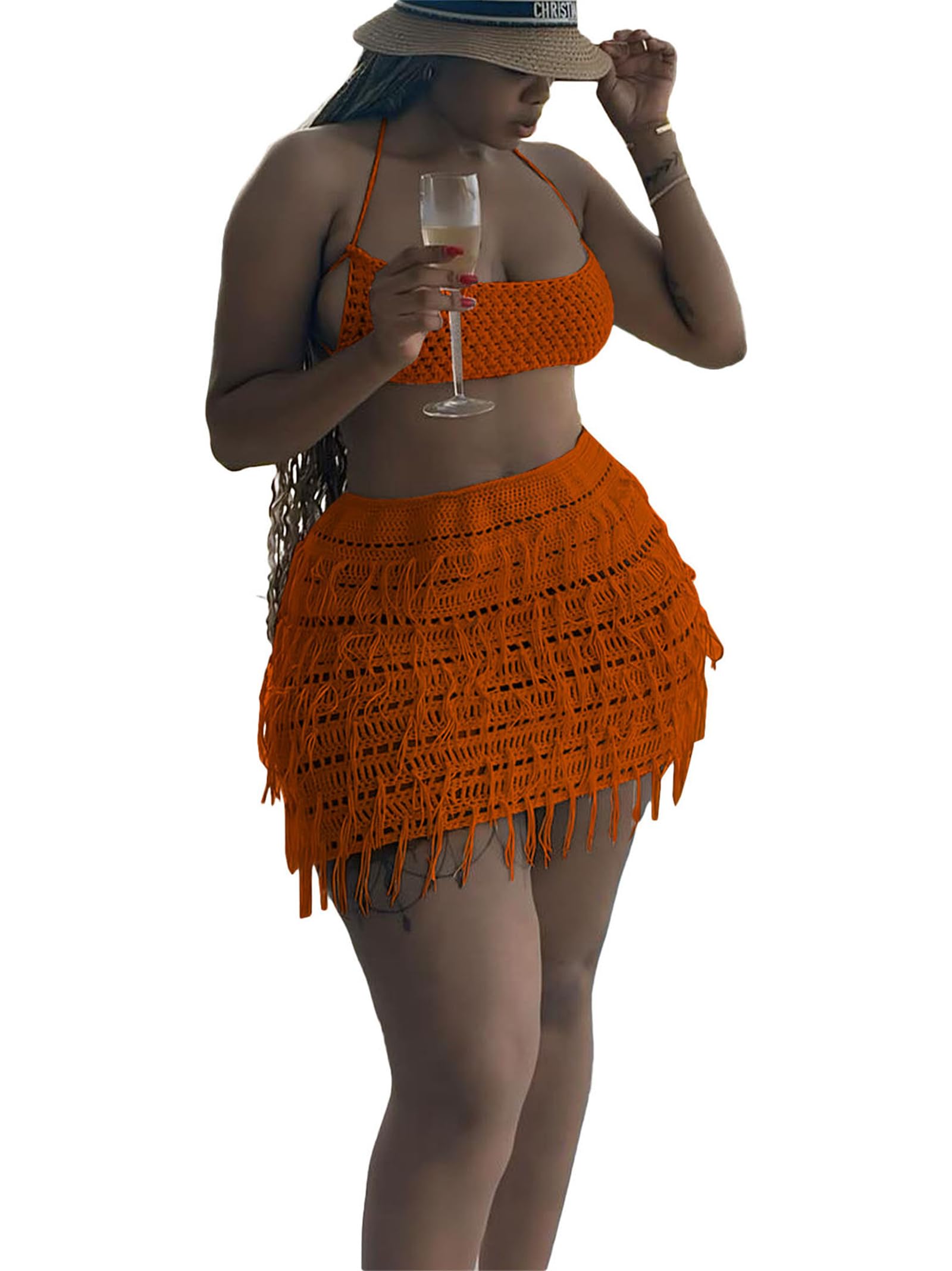 2xl women 2 piece tassel dress set Orange XX-Large 8
