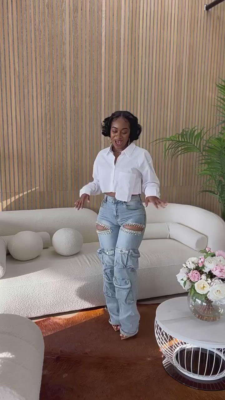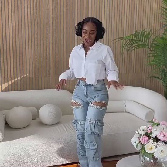 Hollow Rhinestone Multiple Pockets Denim Jeans