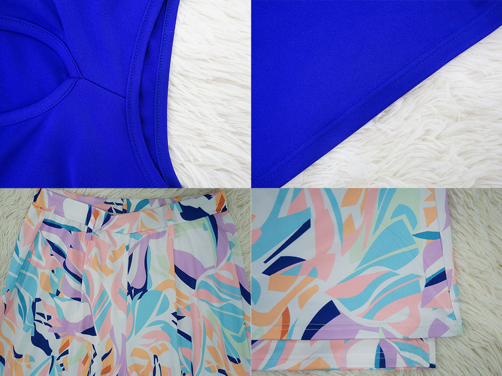 Features: Two-piece outfits, sleeveless, mock neck, solid color, cut-out, crop top, high waist, floral print, wide-leg, long pants, with a belt.