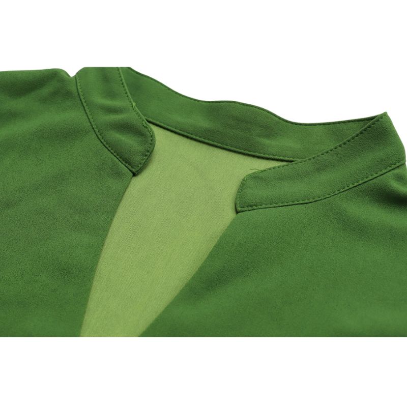 Features: Dress, v-neck, cinched waist, high waist, long sleeves, solid color, tie-up, pocket patch, loose.