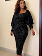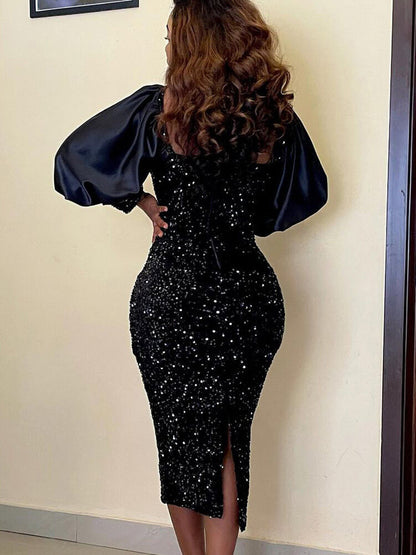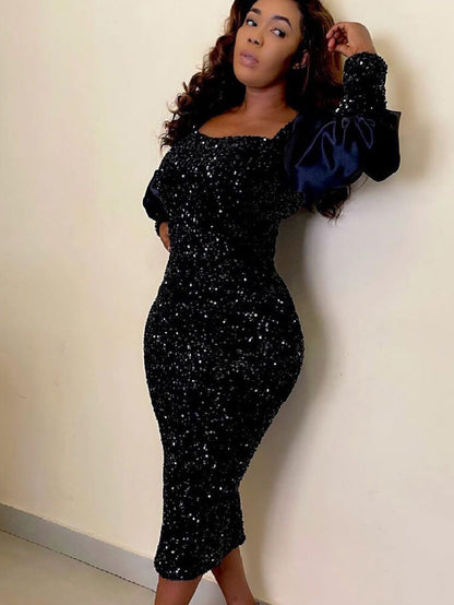 Design: Sequin, glitter, square neck, puff sleeve, patchwork, bodycon, long sleeve midi dress.