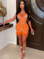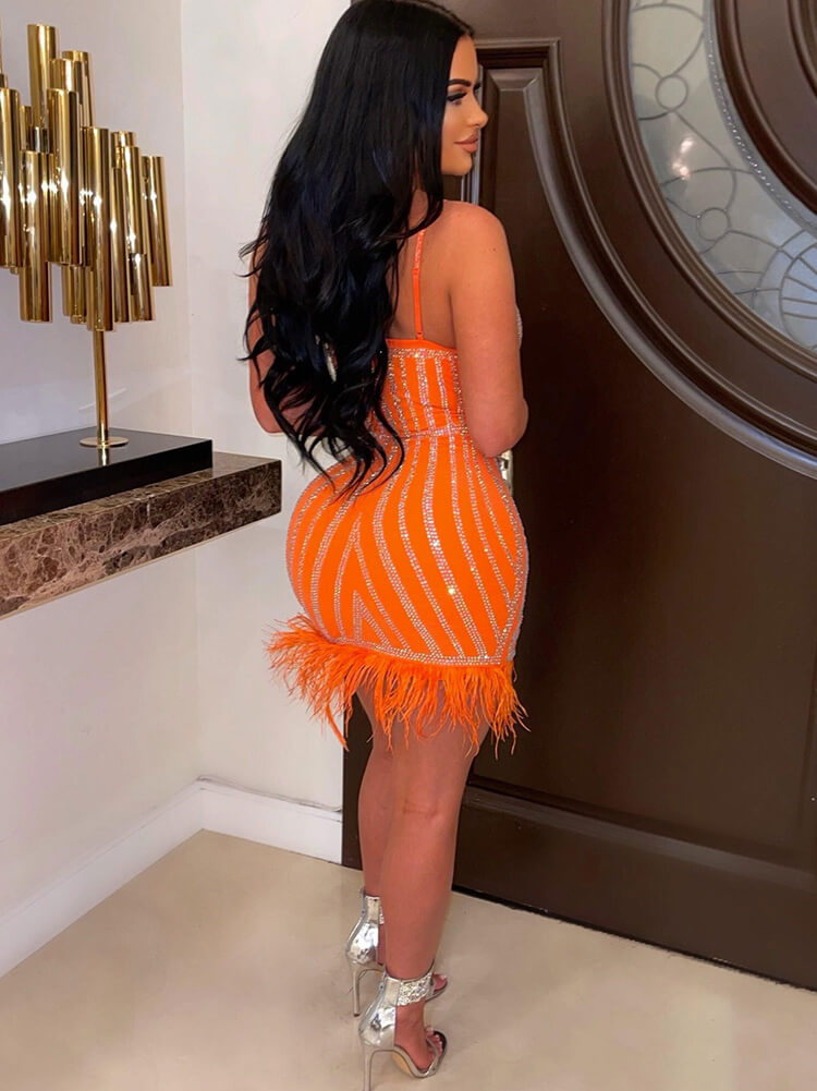 Feature: Rhinestone, spaghetti strap, sleeveless, patchwork, feather, bodycon, mini dresses.