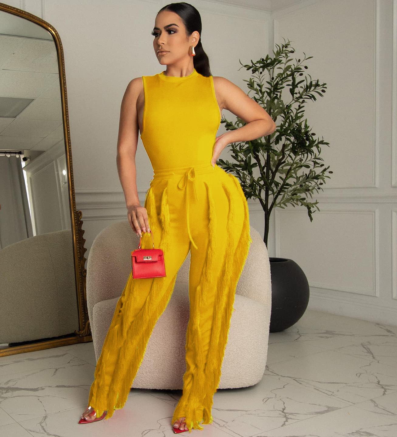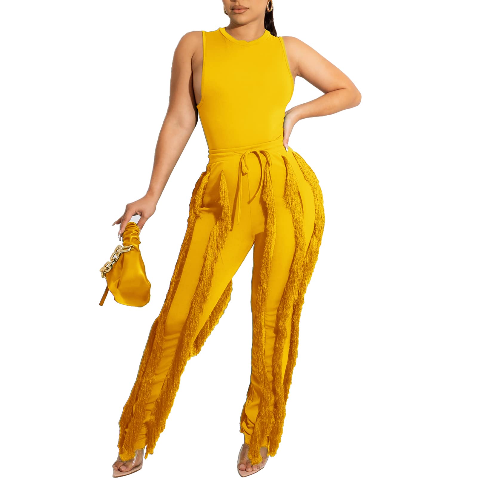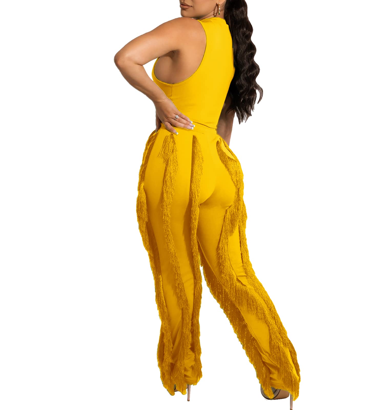 Women 2 Piece Fringe Pants Sets Yellow Medium 3