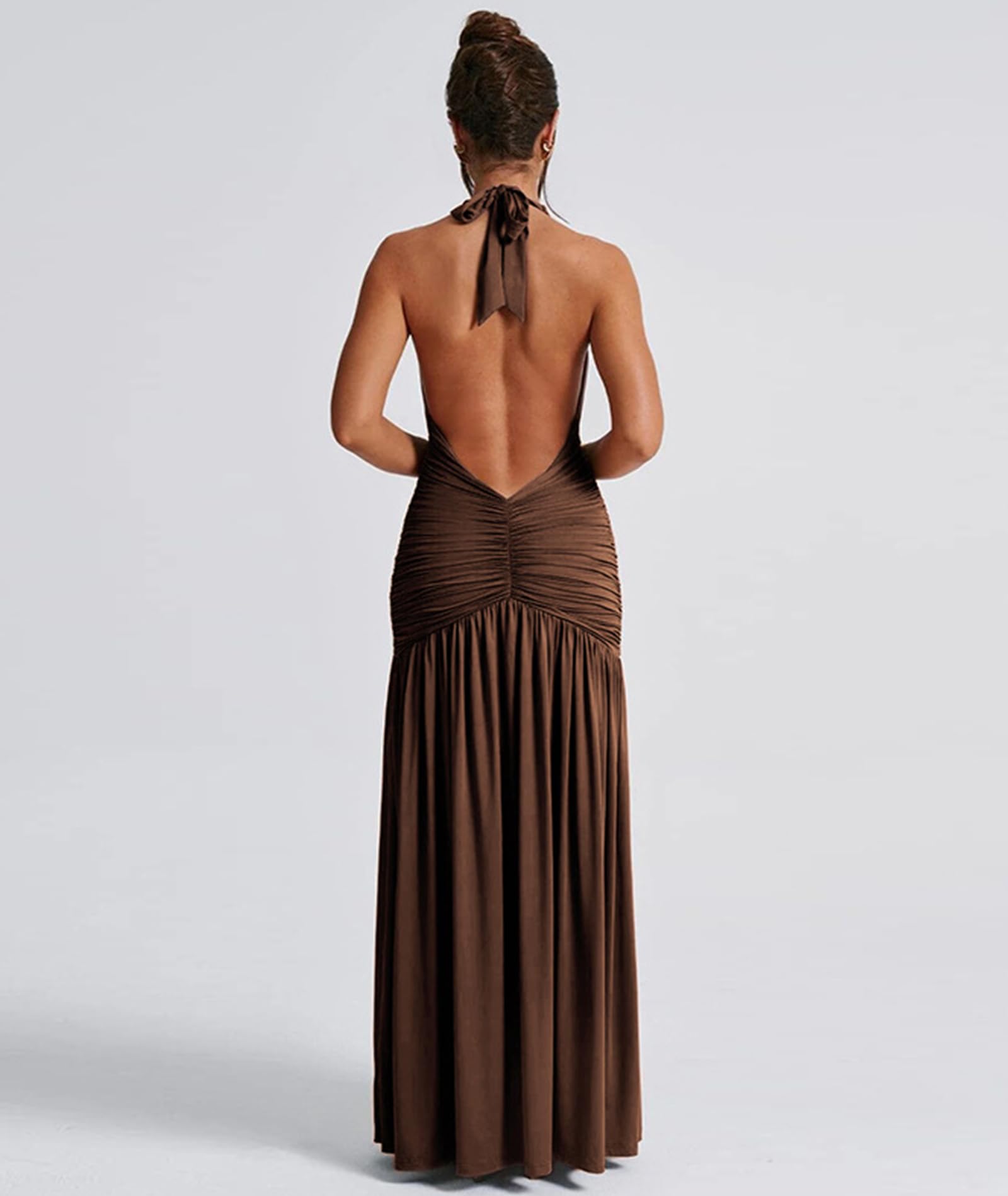 Women Halter Deep V Neck Maxi Dress Brown Large 4