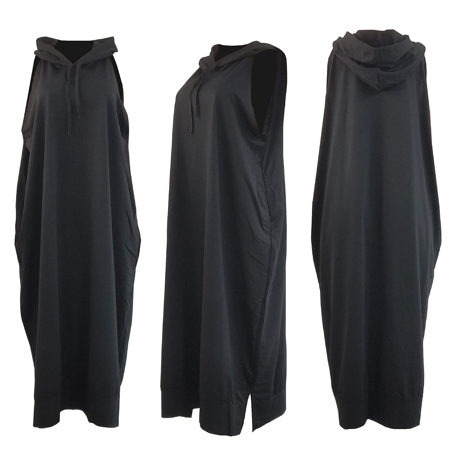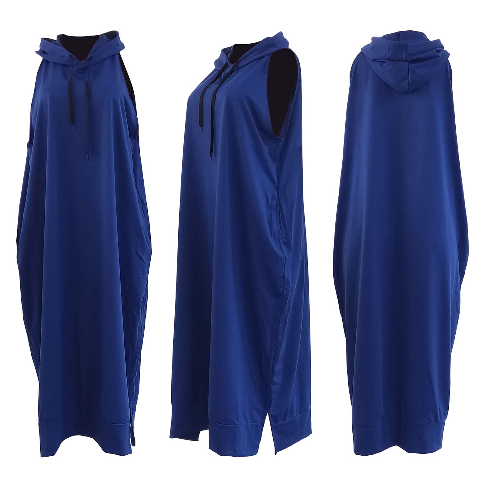 Características: sudaderas con capucha, color sólido, vestidos midi, sin mangas, largo por encima de la rodilla, abertura, vuelo, capucha con cordones, tiene bolsillo.