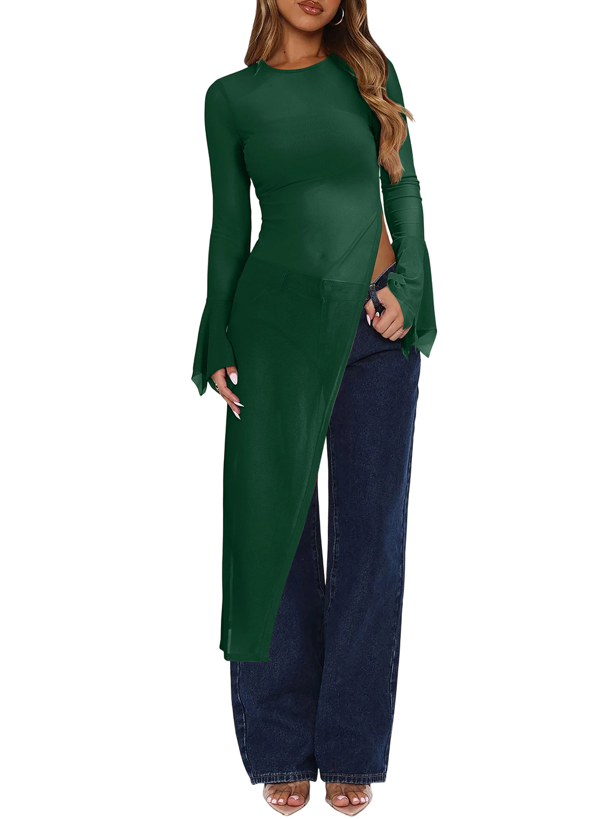 Long Bell Sleeve Mesh Sheer Green X-Large 5