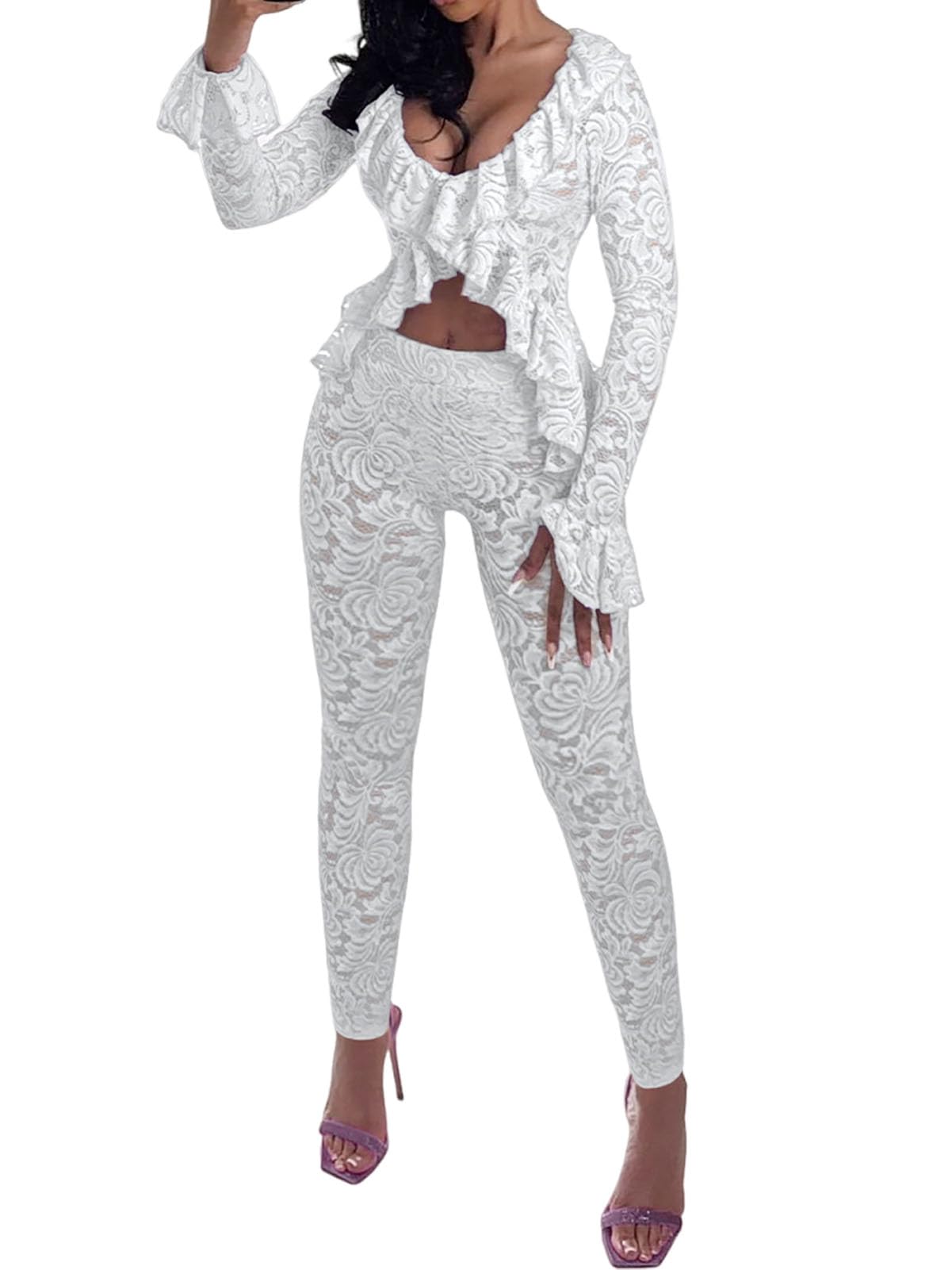Women Two Piece Lace Outfits Set White Large 2