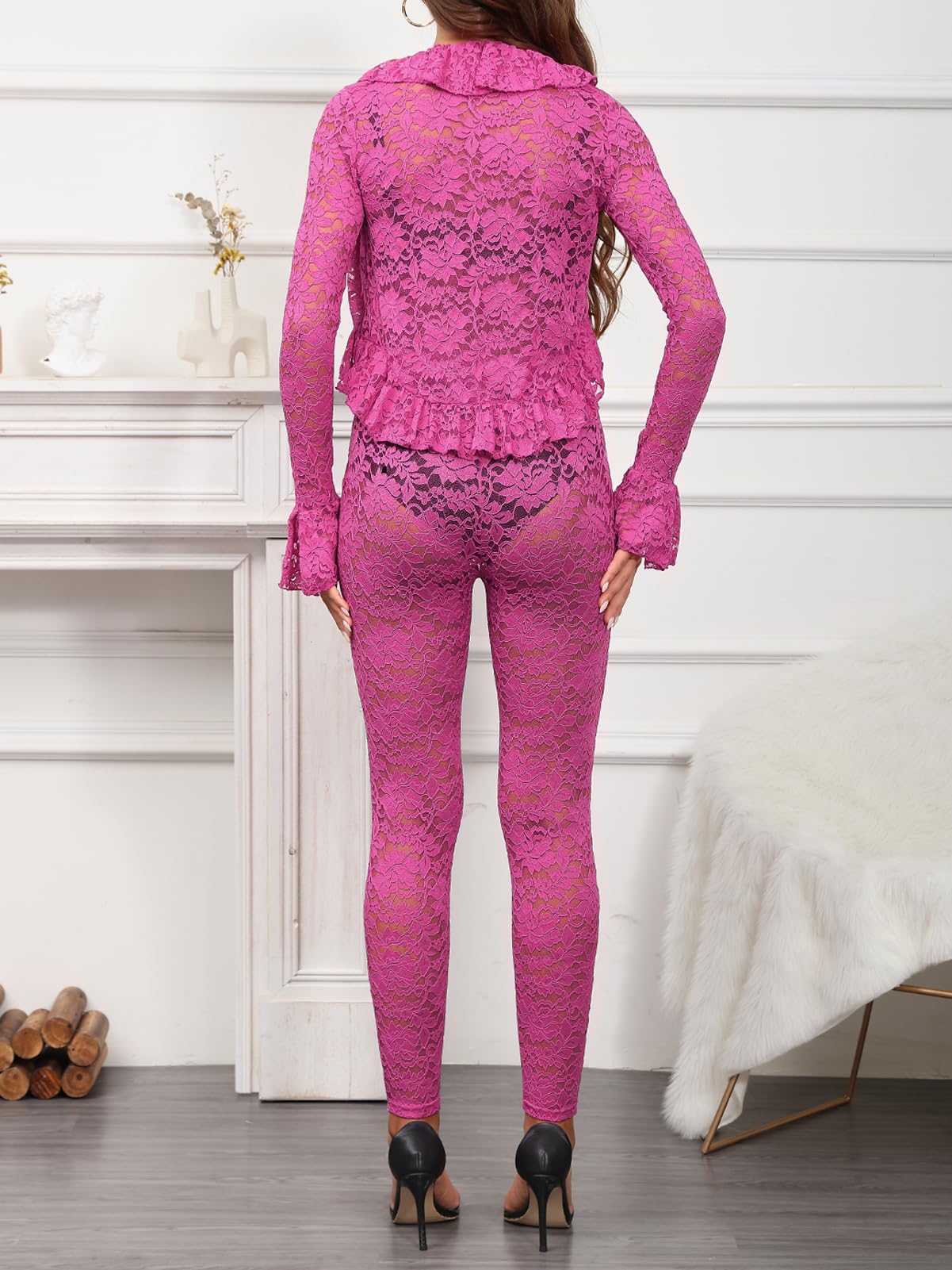 Women Two Piece Lace Outfits Set Rose XX-Large 2