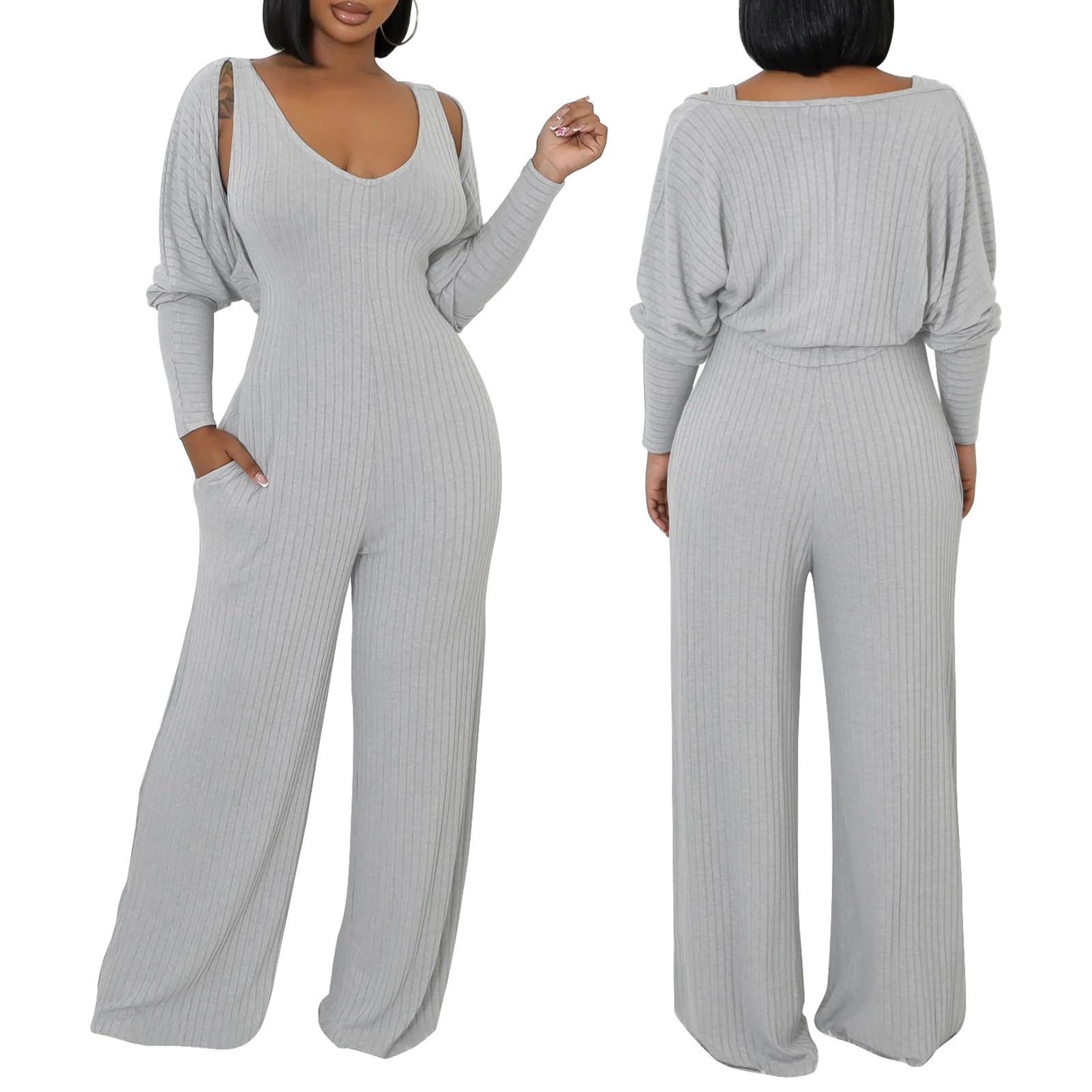 V Neck Wide Leg Jumpsuits Set Grey Large 8