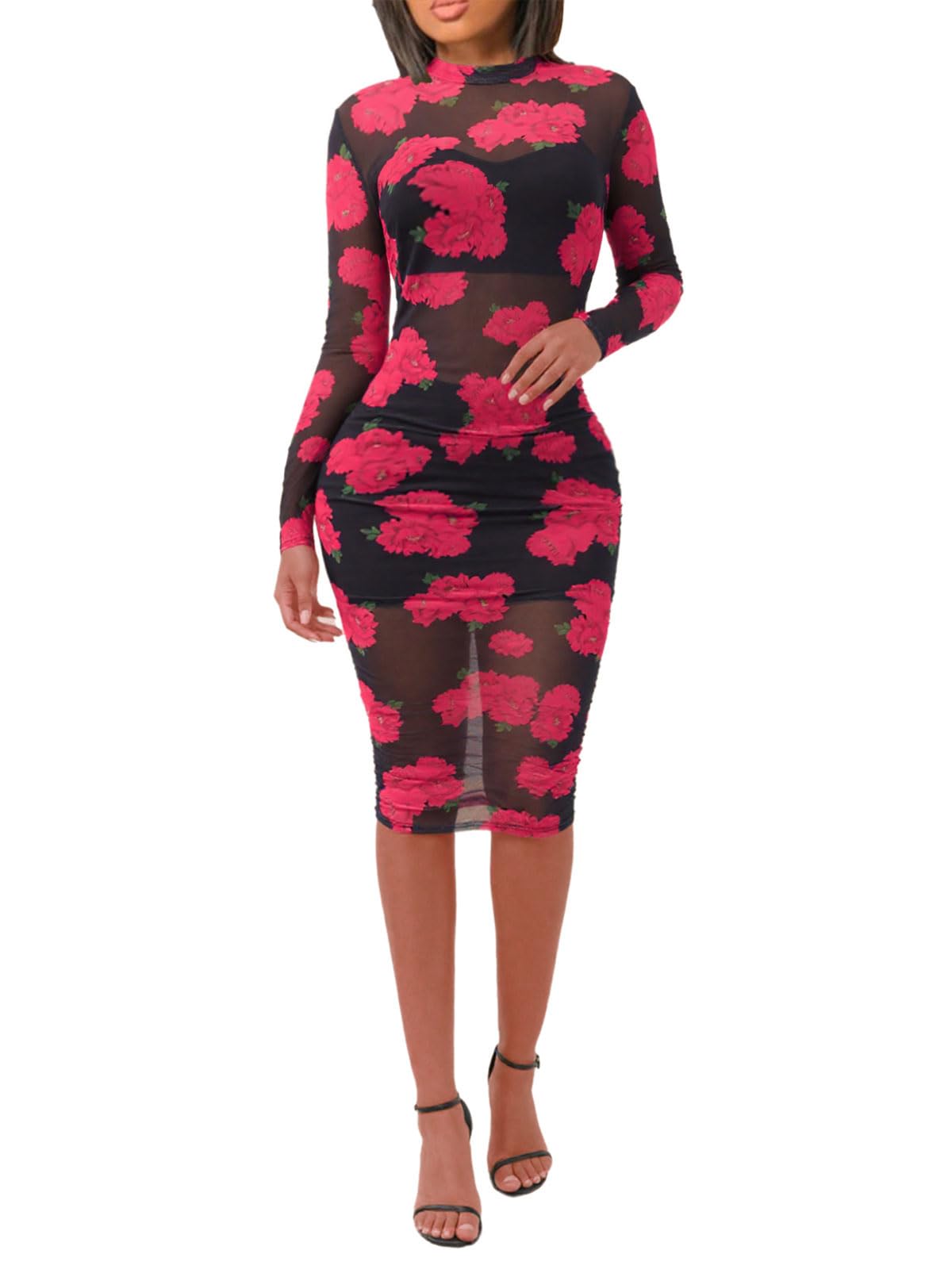 | printed mesh midi bodycon dress | Red Flower | XX-Large | 5 |