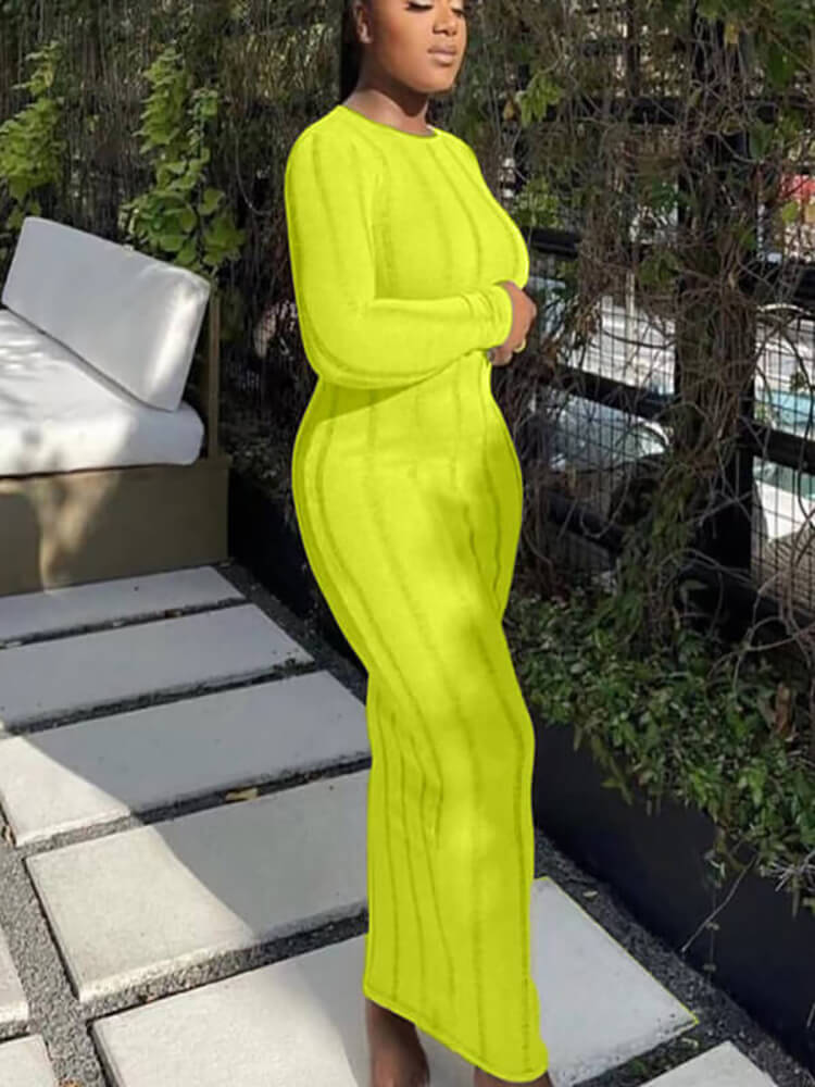 Característica: recortado, transparente, color sólido, cuello redondo, manga larga, sin espalda, borla, bodycon, maxi vestidos.