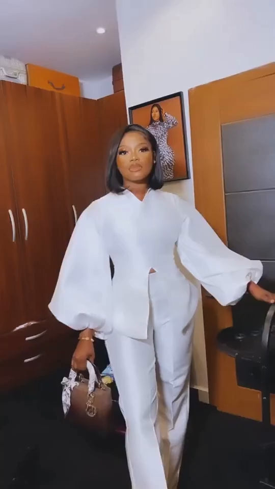 - High-waisted, straight-leg trousers in matching white give a polished, elongated silhouette. The clean lines complement the statement sleeves.