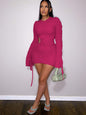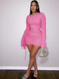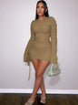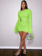 Features: Long sleeves, solid color, cut-out, bubble grid, drawstring, bodycon mini dress.