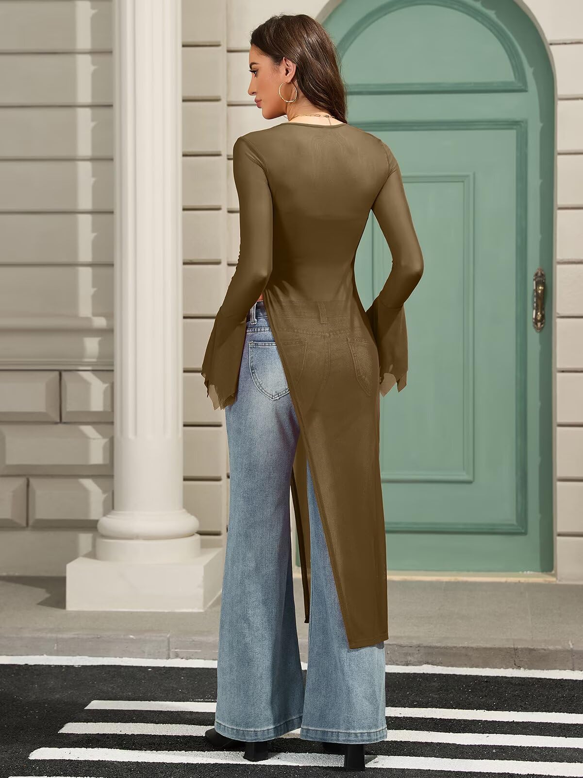 | Mesh Sheer Sexy Tunics Blouse Shirt | Brown | X-Large | 4 |