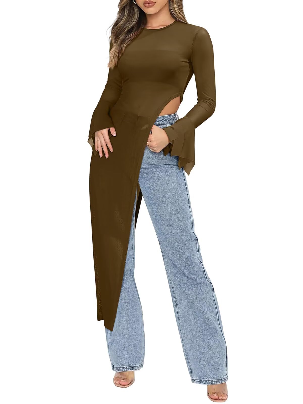 | Mesh Sheer Sexy Tunics Blouse Shirt | Brown | Medium | 1 |