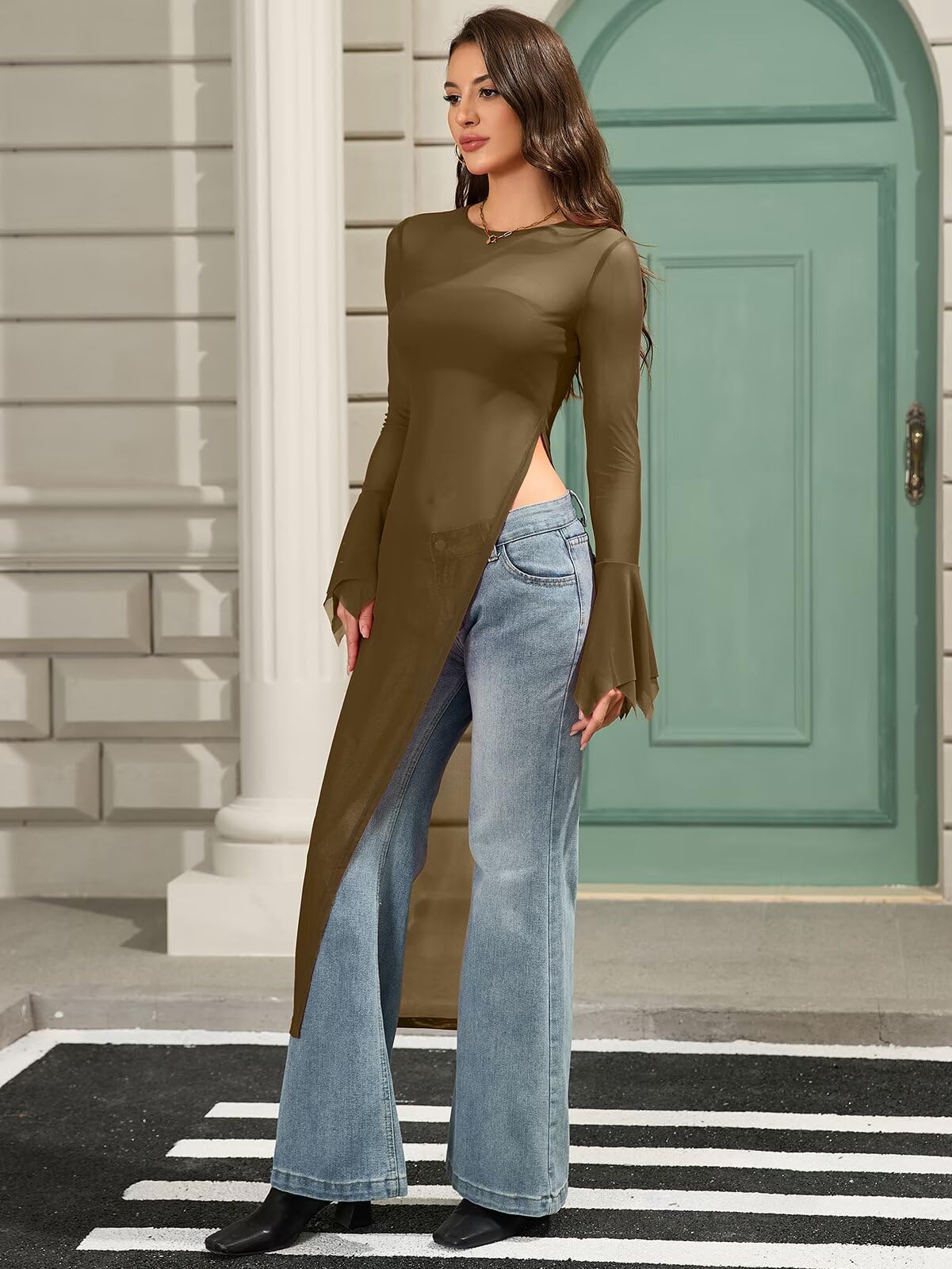 | Mesh Sheer Sexy Tunics Blouse Shirt | Brown | Large | 4 |