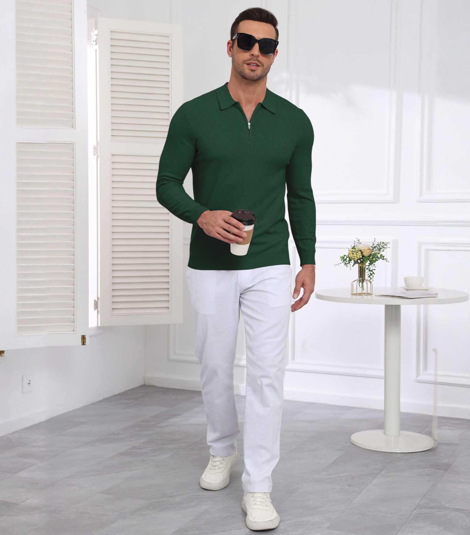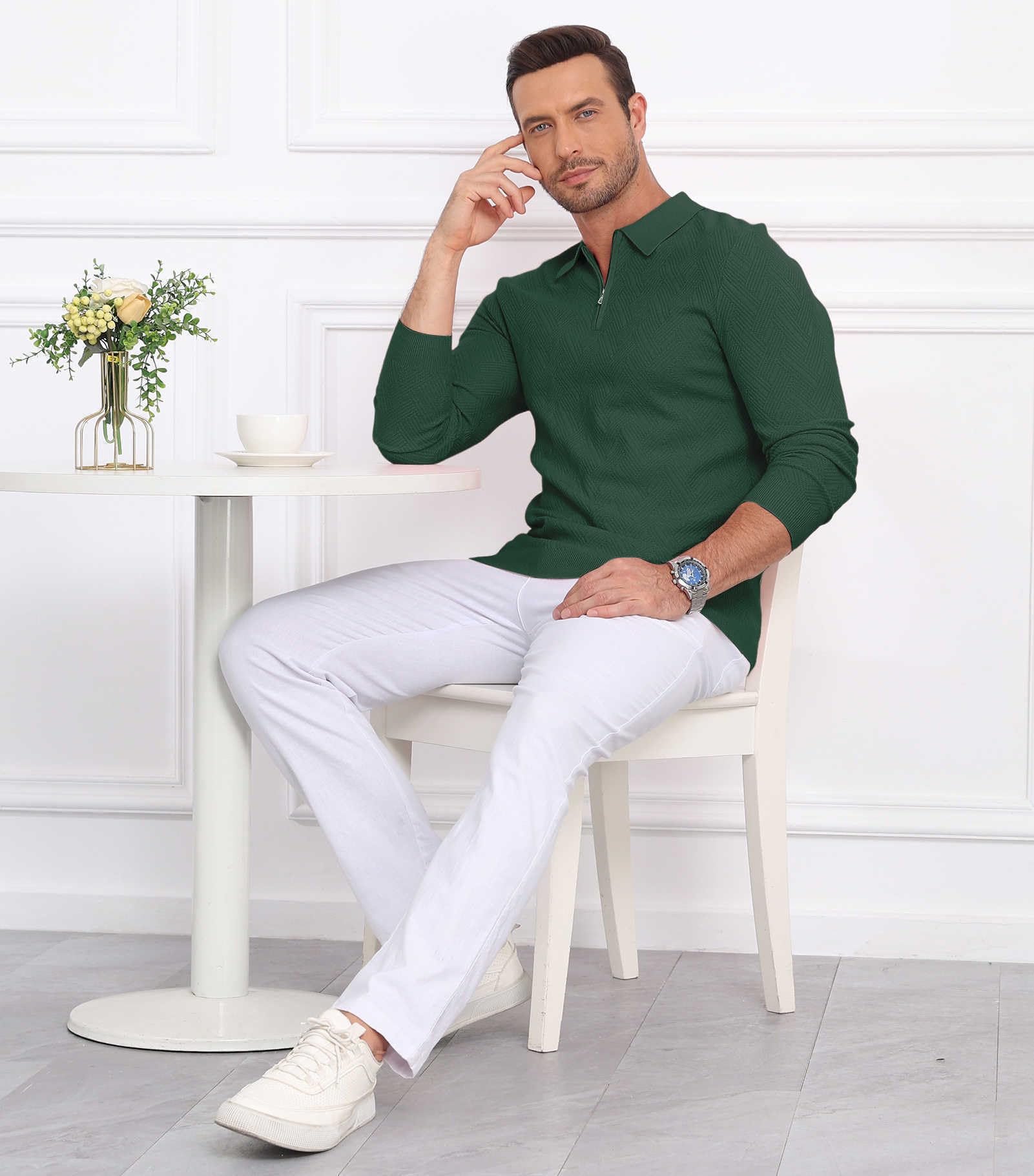 Men's Slim Fit Polo Sweater Lightwe Dark Green Large 5