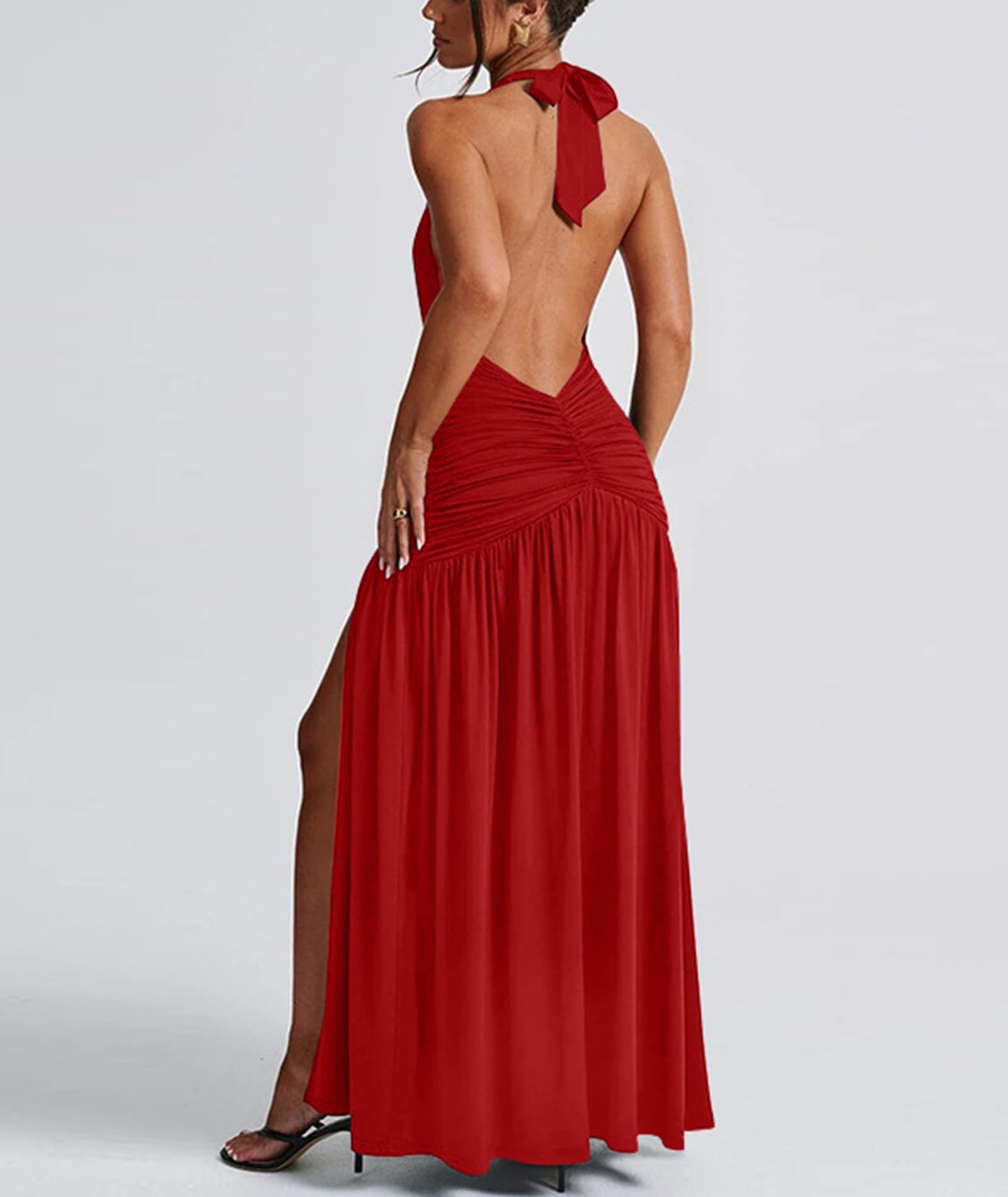 Sexy Halter Deep V Neck Maxi Dress Red Small 15
