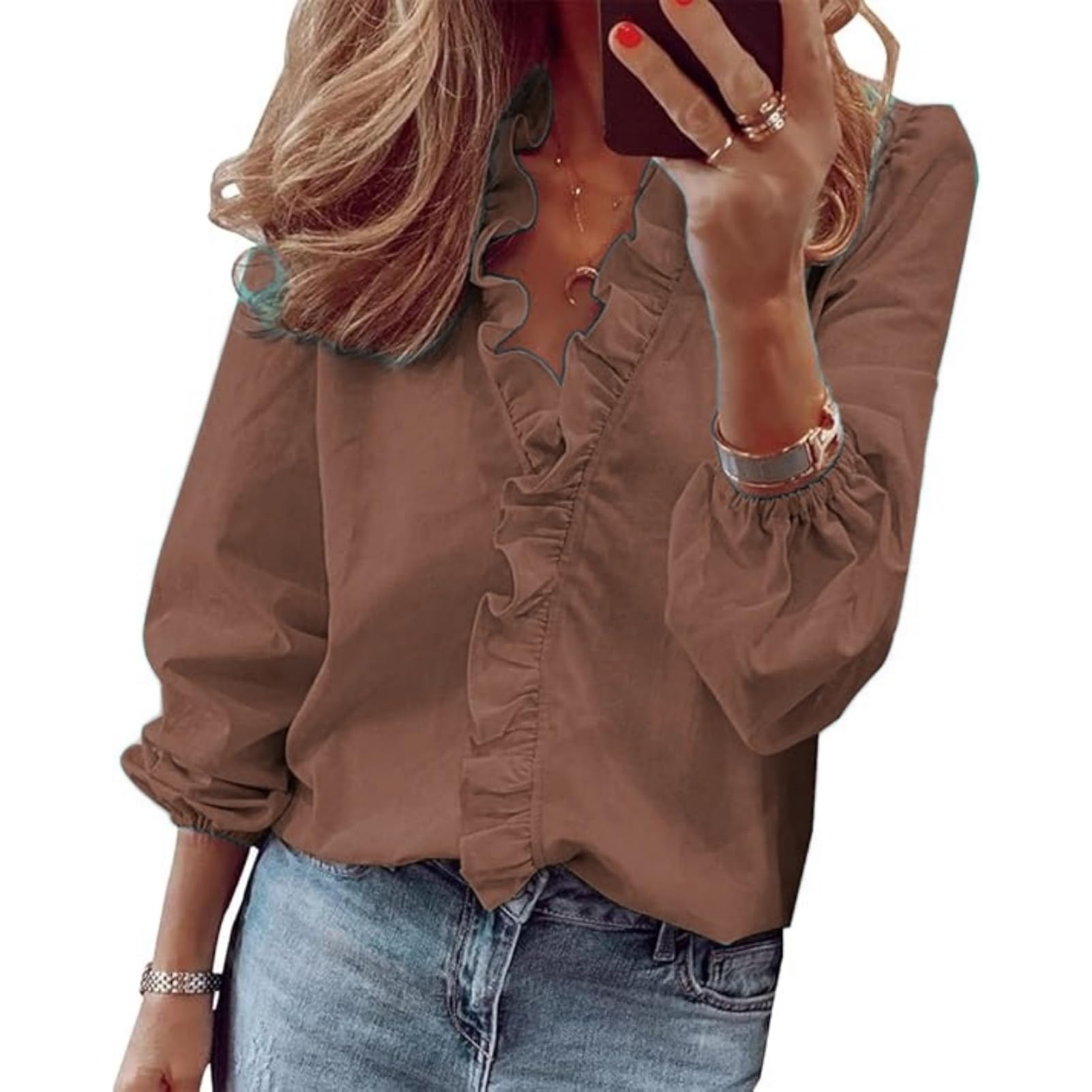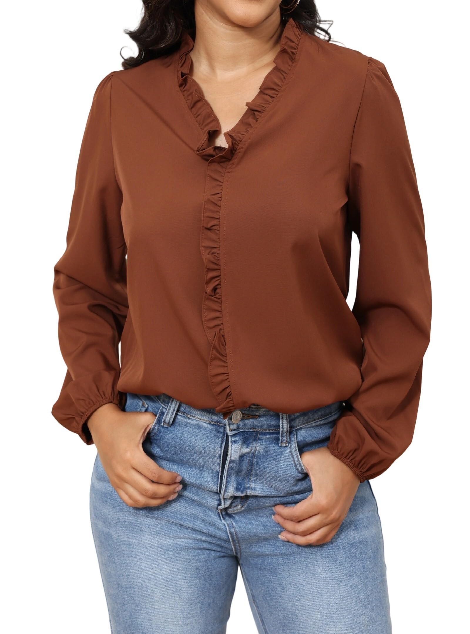 Women Brown Ruffled V Neck Blouses Brown Medium 6