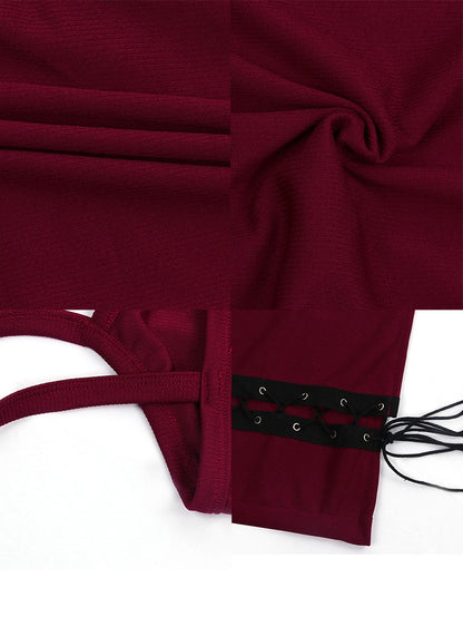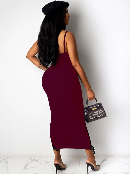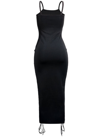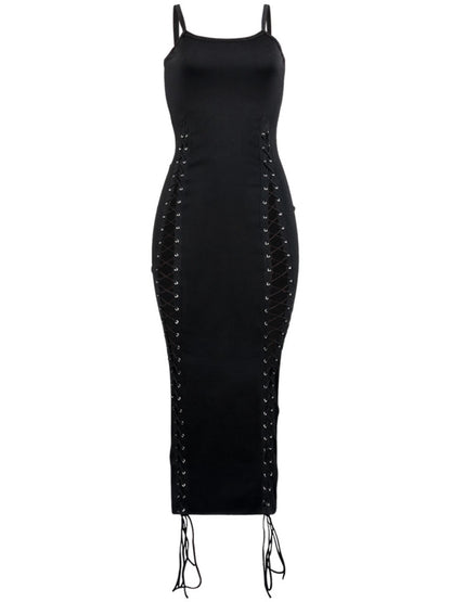Features: Sleeveless, solid color, suture, tie-up, bodycon maxi dress.