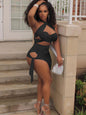 Features: Two-piece outfits, sleeveless, halter, backless, crisscross, crop top, solid color, sexy, tie-up, mini skirt.