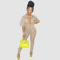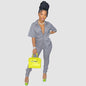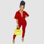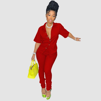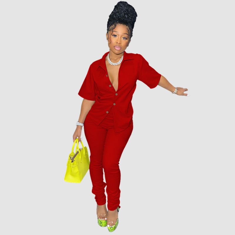 Features: Set, pants, v-neck, shirts, lapel, long pants, solid color, short sleeve, high waist, tight.