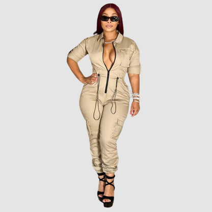 Features: Jumpsuits, pants, cargo pants, relaxed fit, drawstring waist, high waist, zipper front, lapel, patch pocket, solid color, long sleeves, oversized.