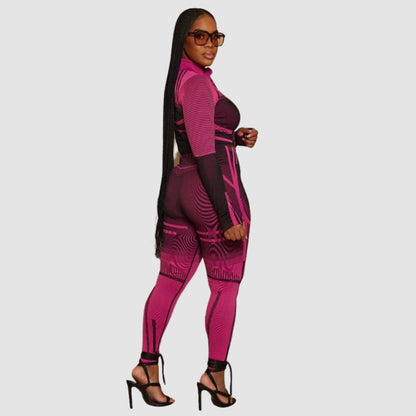 Features: Set, pants, crew neck, crop top, lapel, zipper, long sleeve, long pants, bodycon, irregular printed design, high waist.