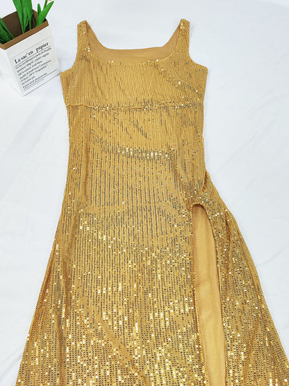 Feature: Sequin, sleeveless, solid color, split, square neck, bodycon, maxi dresses.