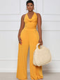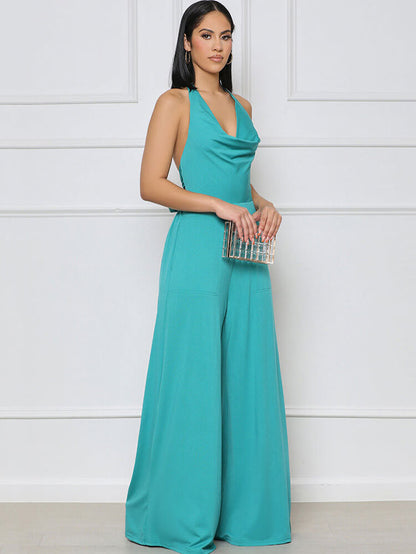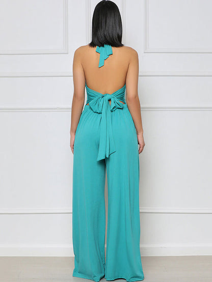 Halter Neck Backless Lace Up Wide Leg Jumpsuit