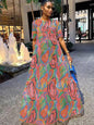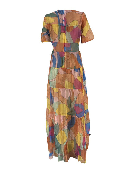 Mesh Short Sleeve Print Flowy Maxi Dress