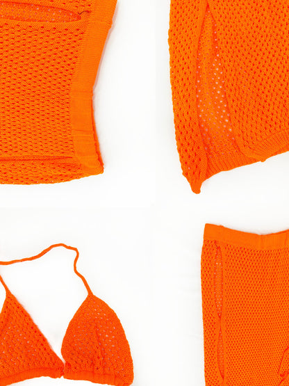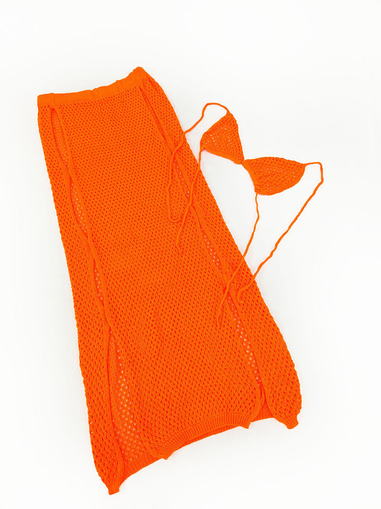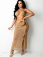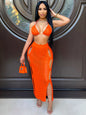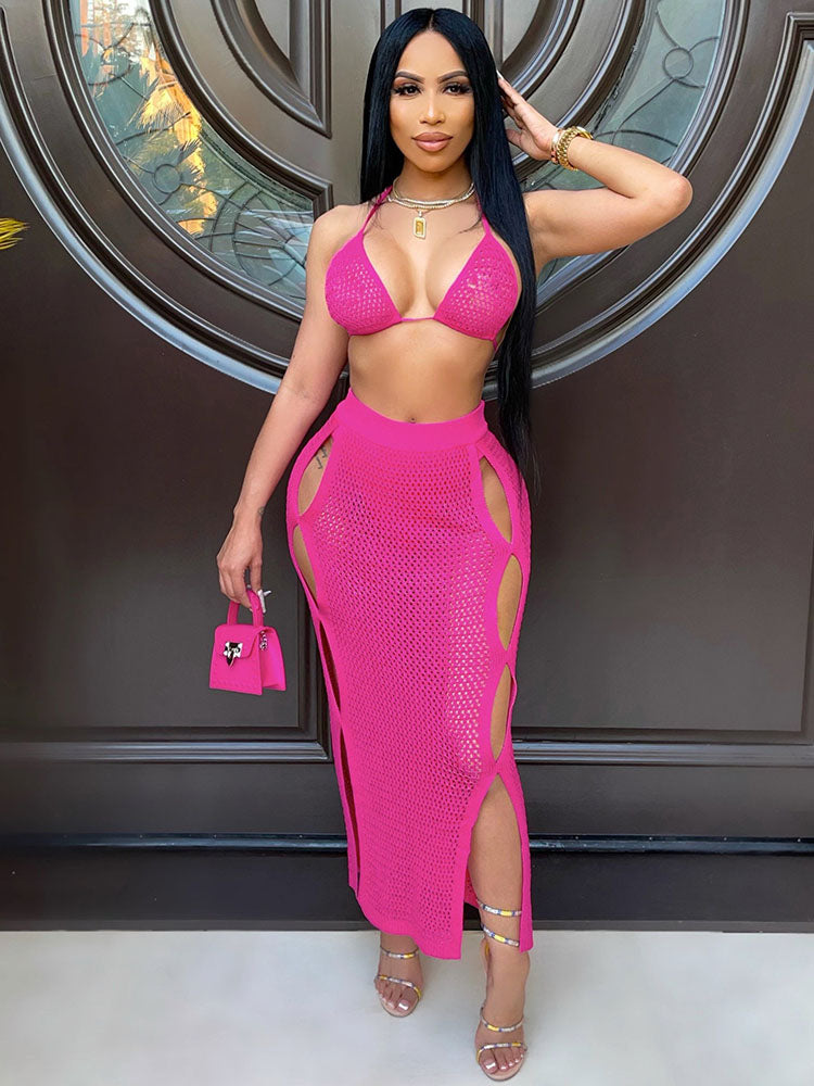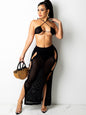 Features: See-through, sheer, two-piece outfits, sleeveless, backless, halter, tie-up, solid color, bra, hollow-out, maxi skirt.